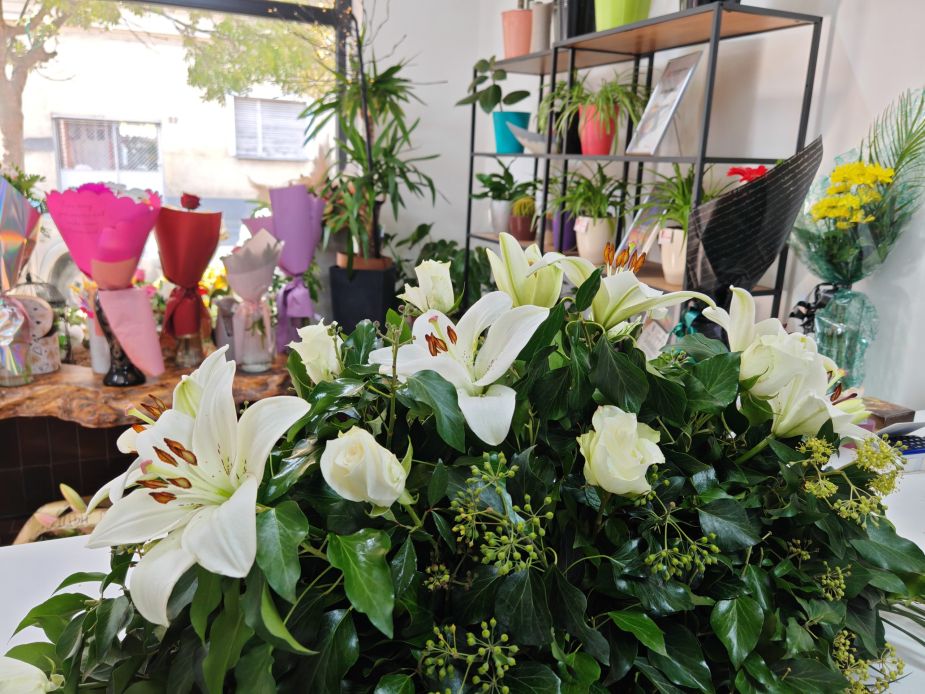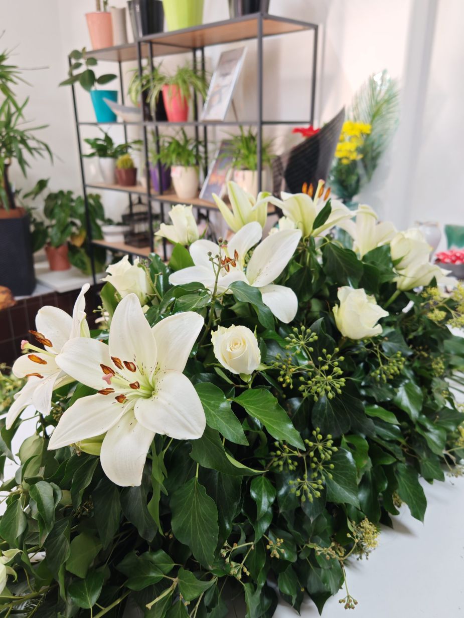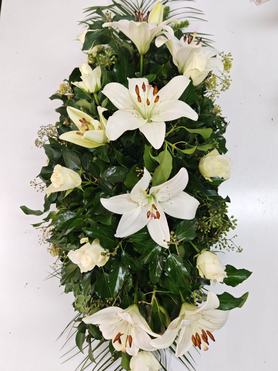 Suza izrađena sa belim ljiljanima i uvoznim belim ružama. Ovaj spoj iskazuje poštovanje i večnu ljubav. Aranžman zrači elegancijom, pružajući utehu svima koji se opraštaju.